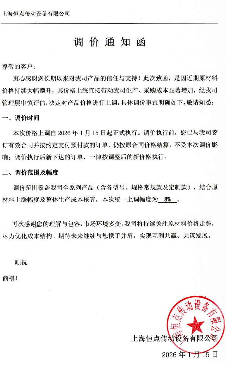 本次價格上調自2026年1月15日起正式執行。調價執行前,您已與我司簽訂有效合同並(bìng)按約定支付預付款的訂單,仍按原合同價格結算,不受本次調價影響;調價執行後新下達(dá)的訂單,一律按調整後的新價格執行 。