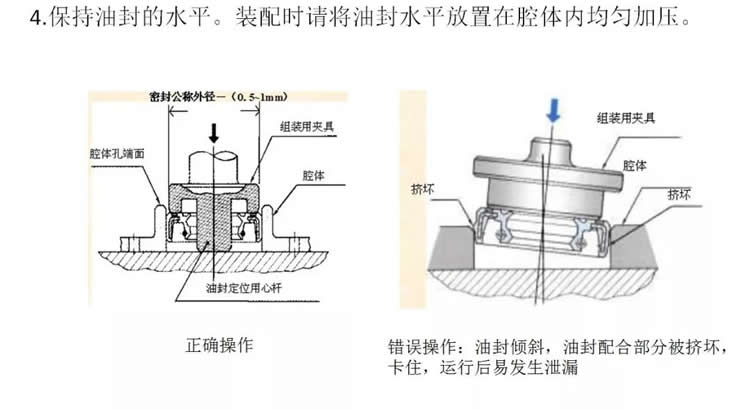2.油封要平裝 ,不能有傾斜的現象。建議採(cǎi)用油壓設備(bèi)或套筒工具安裝。壓力不要太大,速度要均勻、要慢。