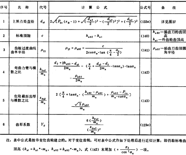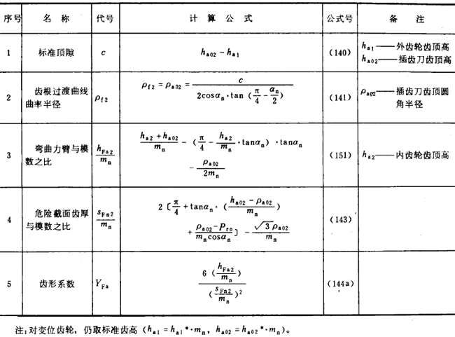内齒輪的齒形系數YF不僅與齒數和變位系數有關,且與插齒刀的參數有關。爲瞭簡化計算,可近似按替代齒條計算(見圖27)。替代齒條的法向齒廓與基本齒條相假,齒高與内齒輪相同 ,法向載荷作用角αFen等於αn,並以腳标2表示内齒輪。有關計算公式見表16(适用於Z2>70)。