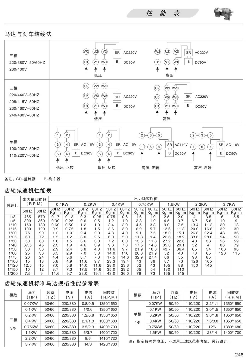 G系列減速機的接線方法,包括三相380V,400V,440V等規格;G系列減速機的性能表,包括速比對應的扭矩,轉速,頻率,電壓,馬力等.詳細見下表: