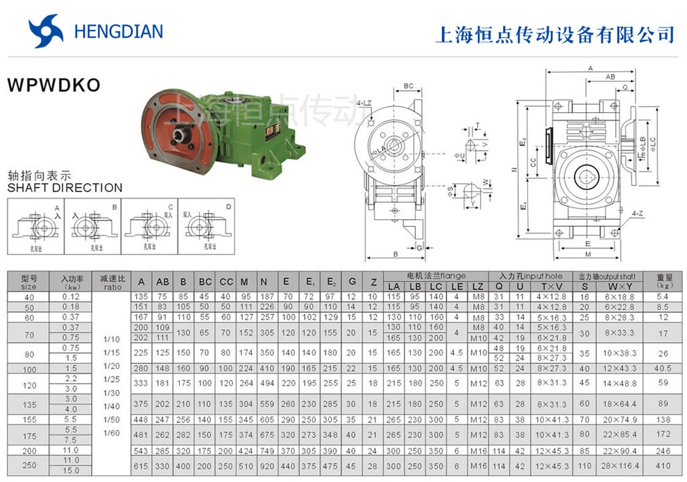 WPWDKO萬能型蝸輪蝸杆減速機選型指南,WPWDKO萬能型減速機法蘭輸入,孔輸出.WPWDKO萬能型減速機軸指向表示方法.機座号40到250,速比10到60.WPWDKO減速機的外形安裝尺寸